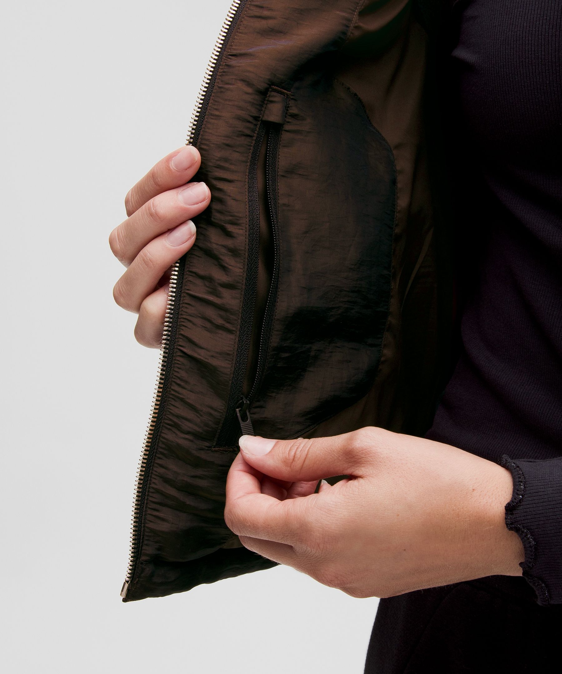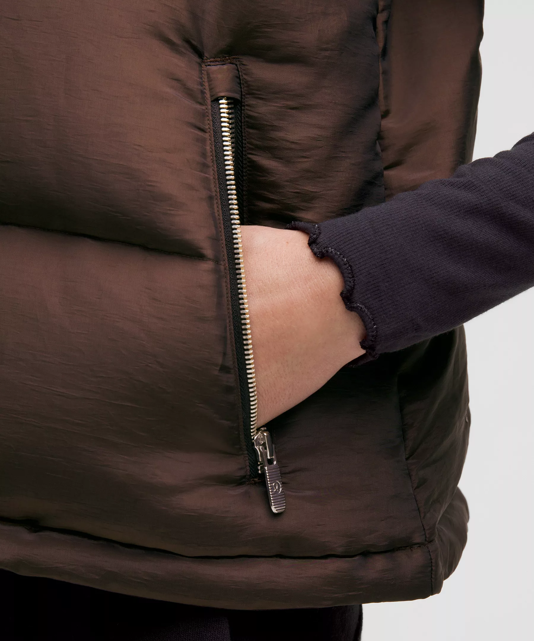 - Zippered hand pockets with a hidden phone sleeve