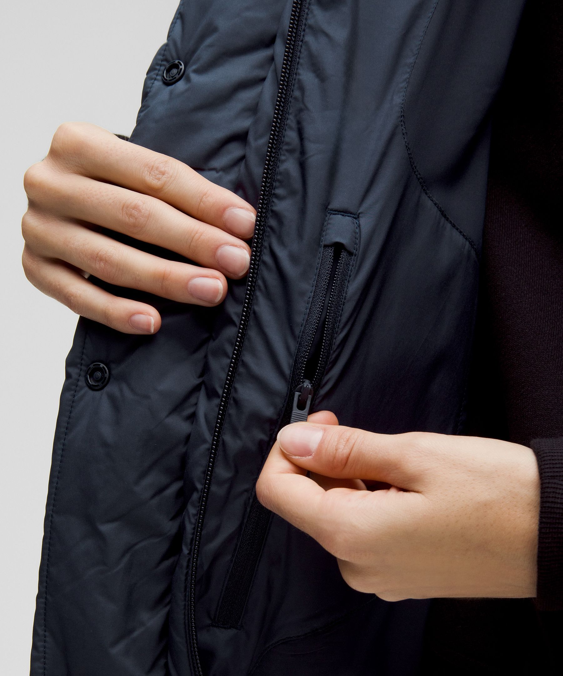 Zippered hand pockets with a hidden phone sleeve